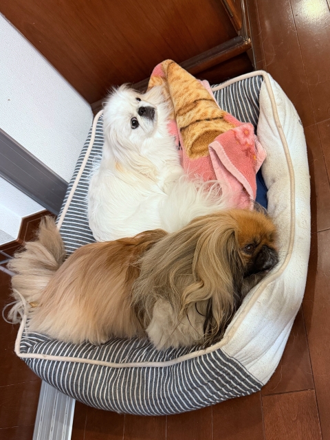 大型犬用のベッドだけど、二人で入っていると狭く感じますね💦