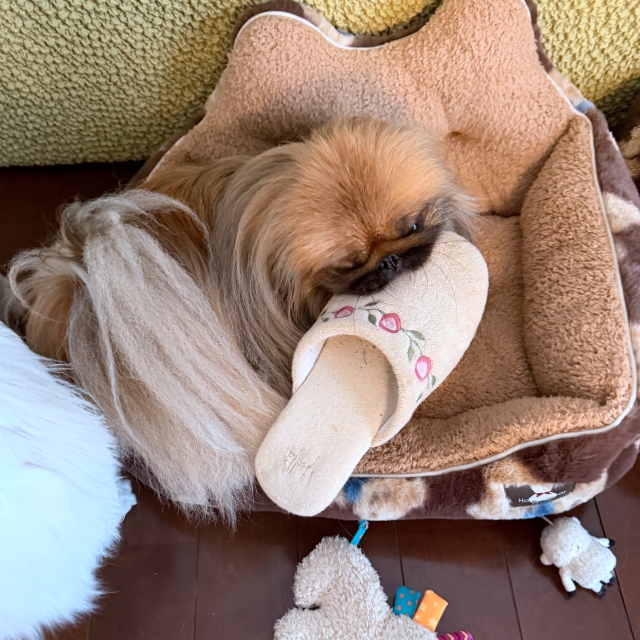 今日はあんちゃんの散歩から帰ると・・・乃音が側へ寄って来て私の履いているスリッパを盗んで行きました😅