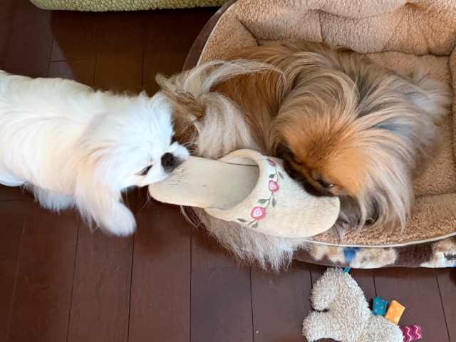 と話しているうちあんちゃんもやって来て、スリッパの取り合いに。。。🥰
