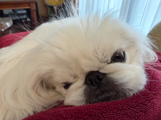 そして、あんちゃんは今日もソファーに座った私の膝の上で、すやすや寝始め・・・流石に7kgの
