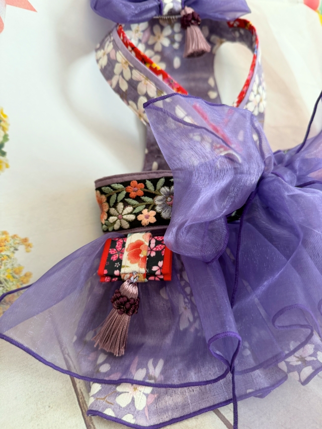 そして最初に作ったはこせこは、胸の合わせに挿せないからこんな所に付けてはと思い取り敢えず仮置きしてみました。重ね襟につけた赤い和柄の生地は、今使っているリードのあまり生地で出掛ける時はいつも使っているリードをつければ、紫に赤いリードがアクセントになるかと。。。😋