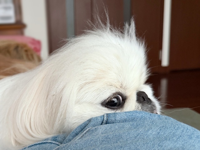 私がソファーで座っていたら、あんちゃんが顎を乗せてボーッと窓を眺めていました。