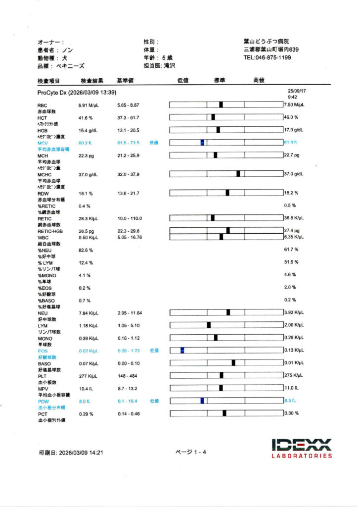 2025年9月17日(水)完全血球検査(27項目)・腎機能検査・SDMA