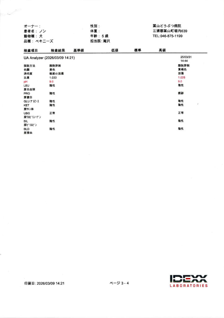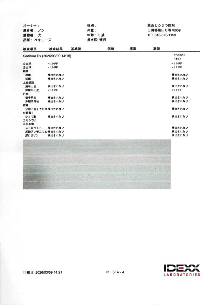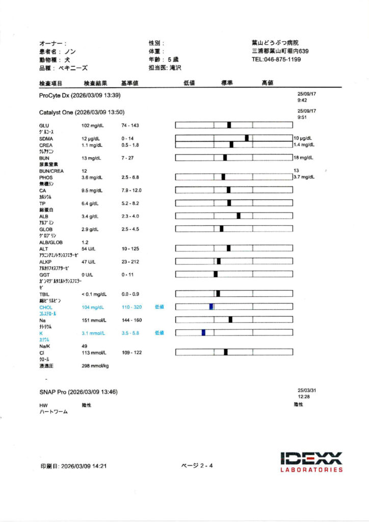 医療費:再診療800円・診察料3,000円・採血料1,000円・フィラリア検査4,000円・完全血球検査4,100円・血液生化学検査7,100円・SDMA3,200円・X線検査9,500円・尿検査5,000円・フィラリア予防薬(ネックスガードスペクトラ 9ヶ月分)30,960円・逆さまつげ処置料2.000円